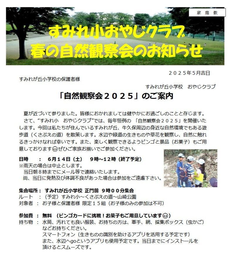 “すみれ小 おやじクラブ”では、下記の とおり「自然観察会2024」を開催いたします。こちらの案内チラシをご覧ください。最も身近な自然環境でもあるすみれが丘公園に、鳥や樹木、草花などどんな生きものがいるのか、どんな暮らしをしているかなどを観察し、自然との触れ合いのきっかけにします。また、それが私達のくらしとどのようにかかわっているかについても理解を深めたいと思います。ぜひご家族お揃いでご参加ください。